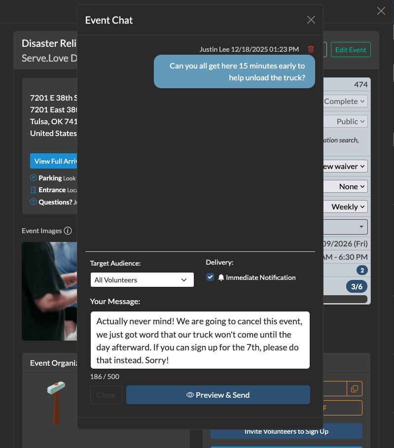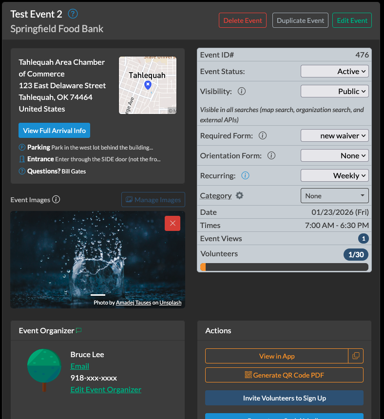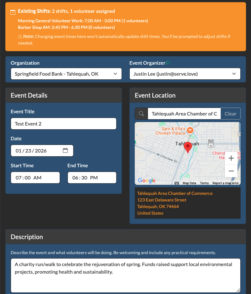Events can be edited anytime—even after they’re live. Changed the start time? Updated the location? Just edit and save. Volunteers who already signed up will see the updated information.