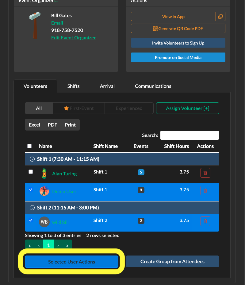 Need to message specific volunteers? Use Selected User Actions from the Volunteers tab. Select who you want to contact, then choose your messaging option.